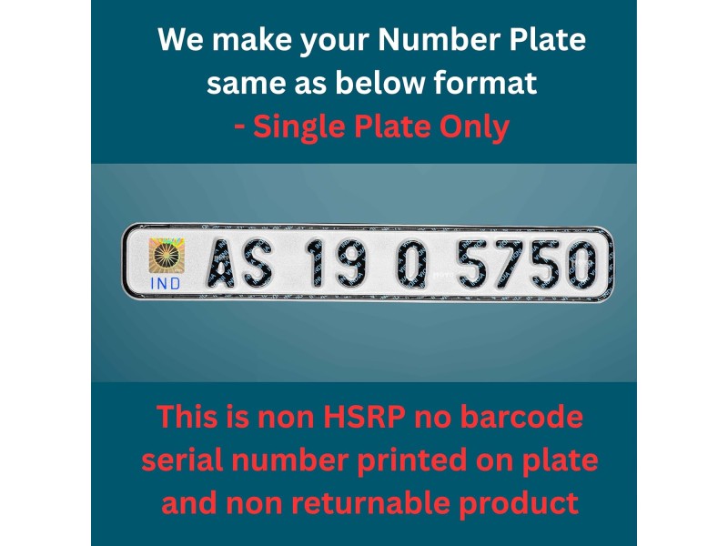 - Format: State code, city code & registration number embossed in correct RTO layout